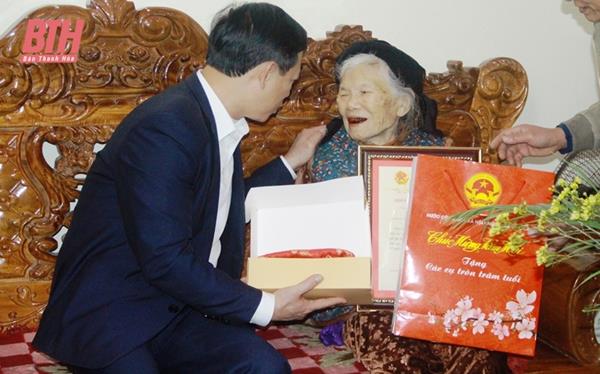 Đồng chí Mai Văn Hải, Phó Trưởng Đoàn ĐBQH tỉnh thăm, tặng quà, trao thư chúc thọ của Chủ tịch nước cho cụ Lường Thị Xuân, ở Khu phố 4, Thị trấn Bến Sung tròn 100 tuổi. (Ảnh: Báo Thanh Hóa)