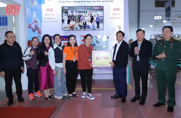Bí thư Tỉnh ủy Nguyễn Doãn Anh và các đồng chí lãnh đạo tỉnh tặng quà cho công nhân Công ty TNHH giầy Annora Việt Nam.
