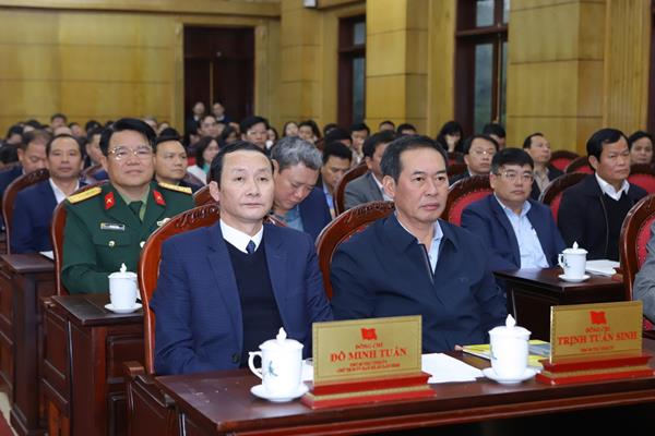 Chủ tịch UBND tỉnh Đỗ Minh Tuấn và Phó Bí thư Tỉnh ủy Trịnh Tuấn Sinh dự hội nghị.