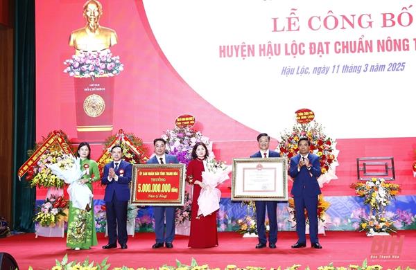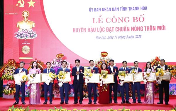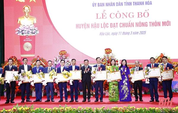 Tại buổi lễ, thừa ủy quyền của Thủ tướng Chính phủ, đồng chí Bí thư Tỉnh ủy Nguyễn Doãn Anh đã trao Bằng công nhận huyện Hậu Lộc đạt chuẩn NTM năm 2023 của Thủ tướng Chính phủ cho huyện Hậu Lộc; đồng chí Phó Bí thư Thường trực Tỉnh ủy, Chủ tịch HĐND tỉnh, Trưởng Đoàn ĐBQH tỉnh Lại Thế Nguyên trao biển tượng trưng tiền thưởng của tỉnh cho huyện Hậu Lộc.