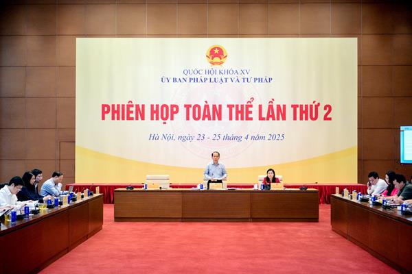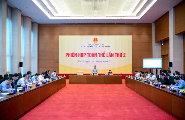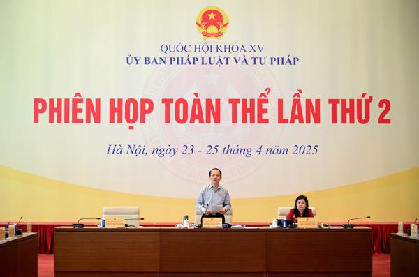 Tiếp tục chương trình Phiên họp toàn thể lần thứ 2, sáng 25/4, tại Nhà Quốc hội, Ủy ban Pháp luật và Tư pháp thẩm tra dự án Luật Tổ chức chính quyền địa phương (sửa đổi) và dự án Luật Cán bộ, công chức (sửa đổi). Ủy viên Trung ương Đảng, Chủ nhiệm Ủy ban Pháp luật và Tư pháp Hoàng Thanh Tùng chủ trì Phiên họp.