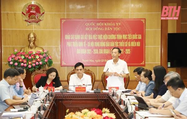 Tiếp tục khảo sát việc thực hiện Chương trình Mục tiêu quốc gia phát triển kinh tế - xã hội vùng đồng bào dân tộc thiểu số và miền núi, giai đoạn 2021-2030, giai đoạn I: từ năm 2021 đến năm 2025, được phê duyệt tại Quyết định số 1719/QĐ-TTg, ngày 14/10/2021 của Thủ tướng Chính phủ (gọi tắt là Chương trình 1719) tại Thanh Hóa, sáng 3/6, Hội đồng Dân tộc của Quốc hội do đồng chí Nguyễn Lâm Thành, Phó Chủ tịch Hội đồng Dân tộc làm trưởng đoàn, đã có buổi làm việc với UBND tỉnh.