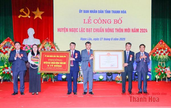 Tại buổi lễ, thừa ủy quyền của Thủ tướng Chính phủ, Bí thư Tỉnh ủy Nguyễn Doãn Anh và Phó Chủ tịch UBND tỉnh Mai Xuân Liêm đã trao Bằng công nhận huyện đạt chuẩn NTM năm 2024 cùng phần thưởng cho huyện Ngọc Lặc. Phát biểu chúc mừng, Phó Chủ tịch UBND tỉnh Mai Xuân Liêm ghi nhận và biểu dương những nỗ lực to lớn của cấp ủy, chính quyền và Nhân dân huyện Ngọc Lặc trong phát triển kinh tế - xã hội, xây dựng nông thôn mới.