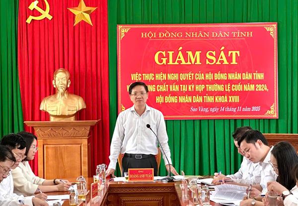 Sáng ngày 14/11/2025, Đoàn giám sát của Thường trực HĐND tỉnh do đồng chí Hoàng Anh Tuấn, Tỉnh ủy viên, Trưởng Ban Kinh tế - Ngân sách HĐND tỉnh làm trưởng đoàn đã tiến hành giám sát việc thực hiện Nghị quyết số 614/NQ-HĐND về nội dung chất vấn tại kỳ họp thường lệ cuối năm 2024, HĐND tỉnh khóa XVIII tại xã Sao Vàng. Cùng tham dự hội nghị có lãnh đạo các Sở: Tài chính, Xây dựng, Khoa học và Công nghệ; Thường trực HĐND xã Sao Vàng.