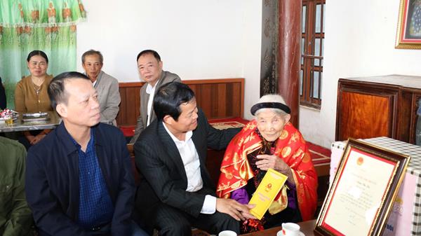 Đồng chí Nguyễn Quang Hải, Tỉnh ủy viên, Phó Chủ tịch HĐND tỉnh thăm, tặng quà và trao thiếp mừng thọ tròn 100 tuổi cho cụ bà Trần Thị Tri, thôn Phú Mỹ, xã Triệu Sơn