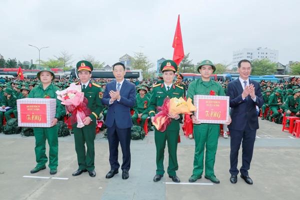 Sau các nghi thức trang trọng của buổi lễ, Phó Bí thư Tỉnh ủy Trịnh Tuấn Sinh cùng các đồng chí lãnh đạo tỉnh, các ban, ngành và xã, phường đã tặng hoa, trao quà động viên tân binh trước giờ lên đường nhập ngũ.